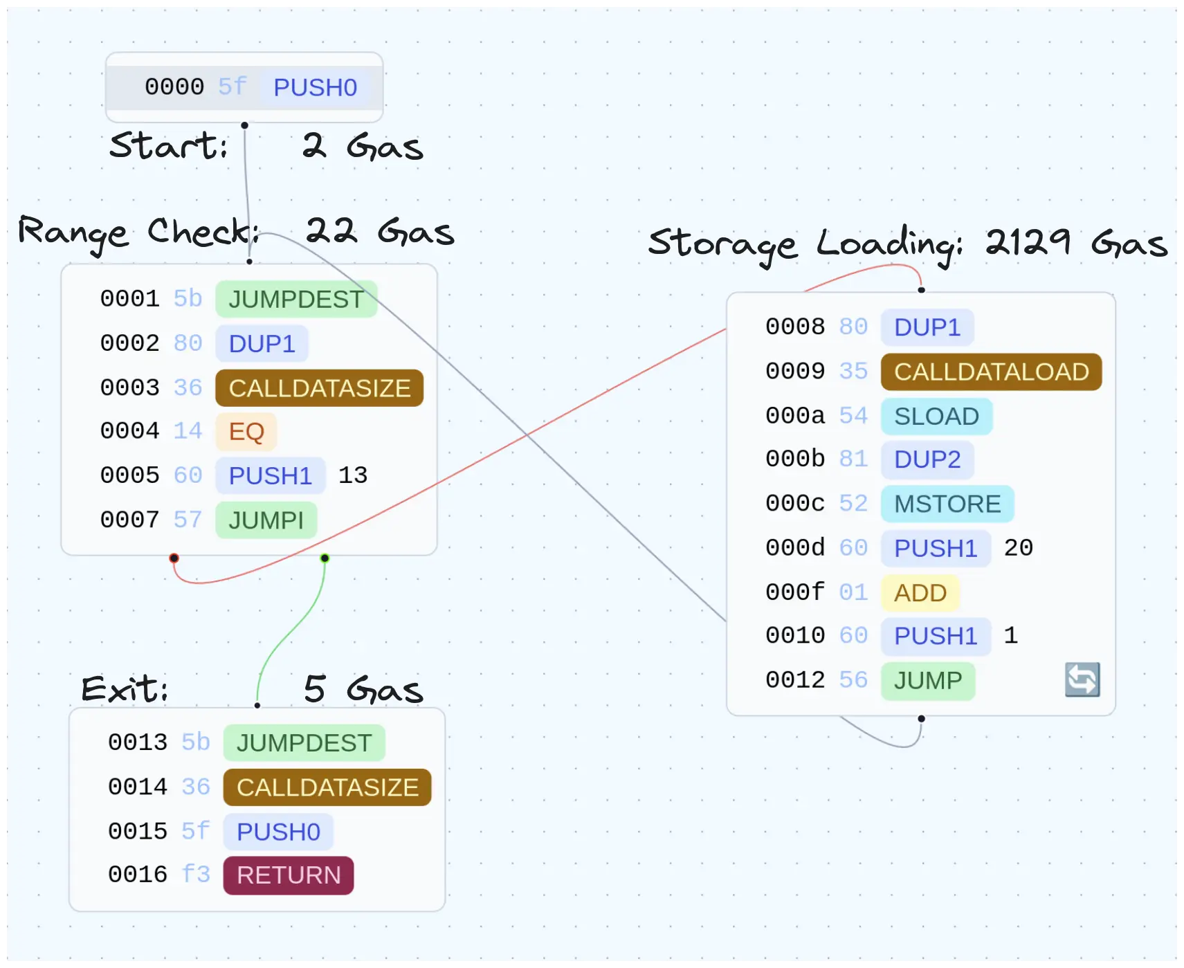 The following handwritten smart contract has been optimized to maximize the number of storage slots we can read in a given transaction. Before diving into the results I’d like to take an aside to dive into this contract as it’s a good example of an optimized single-use contract, with some clever (or at least we think so) shortcuts.