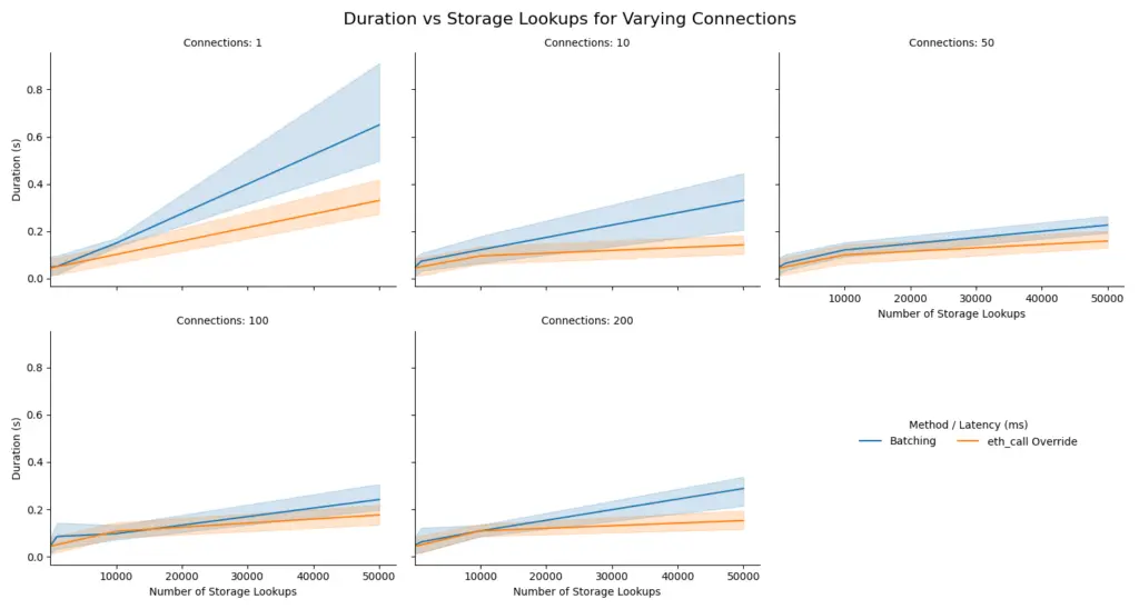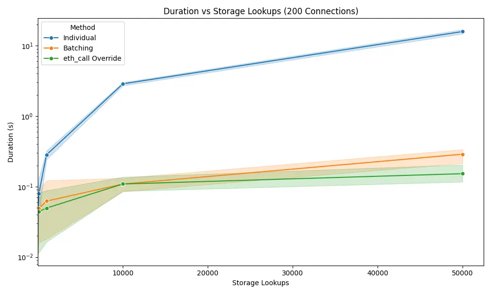 To show the impact of this approach, we wrote a python script which queries a number of storage slots, first using normal RPC requests and batched RPC requests for the normal eth_getStorageAt, and then comparing to the optimized eth_call with state-override set. All the testing code can be found in the storage-extractor repo, along with the bytecode and results.