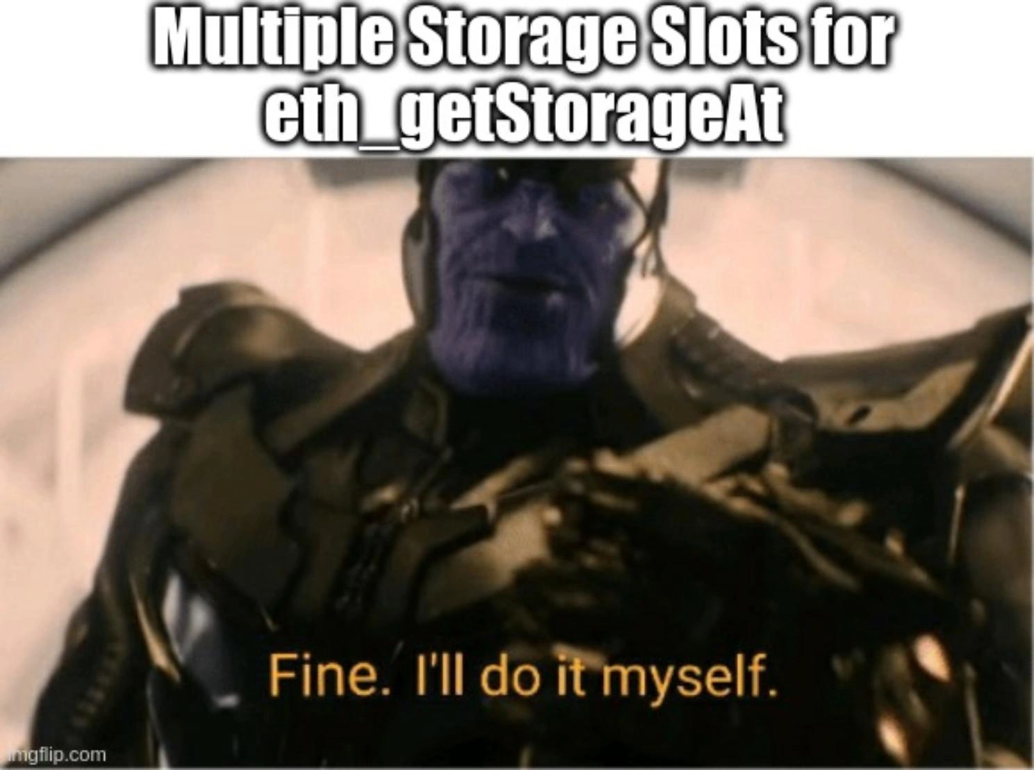 Unfortunately, we cannot use this same trick when getting storage slots, as we discovered when developing our storage explorer, forcing developers to issue an eth_getStorageAt for each slot they want to query. Luckily, Geth has a trick up its sleeve, the “State Override Set”, which, with a little ingenuity, we can leverage to get bulk storage extraction.