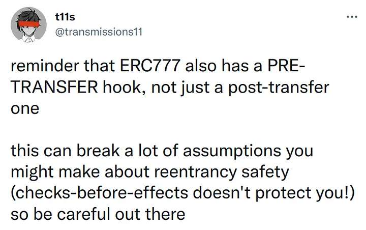 Back on Feb. 24, well-known Ethereum security engineer t11s had tweeted a warning about ERC777 tokens.
