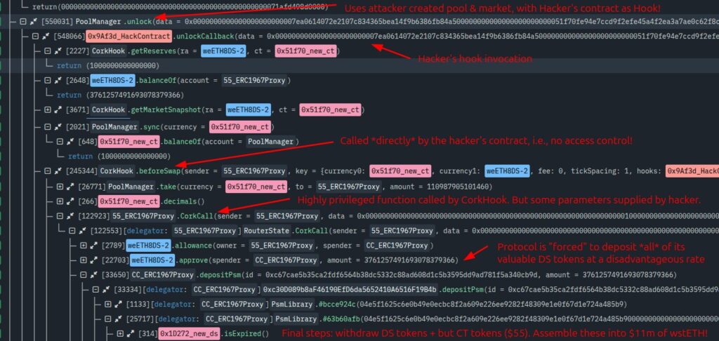 This pool id of the maliciously-created pool was passed into the beforeSwap callback. The hook data supplied as part of the callback directed the protocol to an execution flow by which RAs are deposited and CT and DS tokens are returned. However, in such a transaction no RAs were deposited by the attacker. Instead an amount of roughly 3761 weETH-DS were credited towards the attacker. The carefully crafted hook data payload fooled Cork protocol into thinking that the attacker had deposited 3761 weETH-DS. By doing so the attacker illegitimately gains 3761 new\_ct and 3761 new\_ds tokens.
