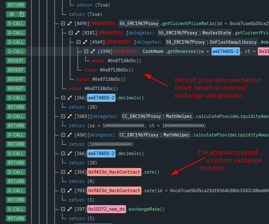 Note that in a previous step the attacker has also exploited another edge case to cheaply acquire weETH-CT tokens. Since writing this article, a clearer explanation was posted by the Cork protocol team about the miscalculations involved, however the essence is that the exploiter acquired a small amount of DS tokens close to the expiry, manipulating the price ratio of CT to RA tokens in the next expiry period. With this manipulation, the exploiter could convert 0.0000029 wstETH (a very small amount) to 3760.8813 weETH-CT.