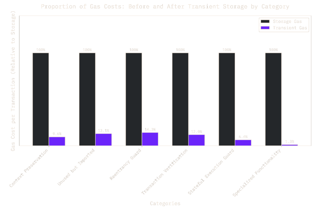 The results were impressive: across all use cases, using transient storage led to an average gas savings of 91.59% compared to regular storage operations. Below, you can find a more detailed graph that shows gas savings per category. Interesting to note that in the case of the Specialized Functionality, gas savings of around 98.7% were recorded. This is because of the airdropping contract mentioned above, and in this case memory might have been a more adequate comparison.